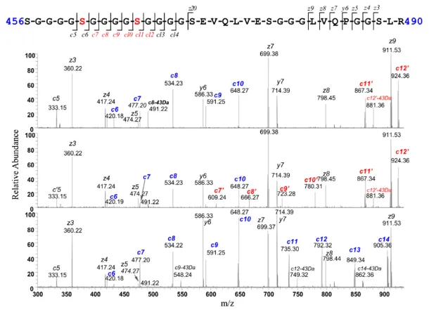 至于木糖的修饰位点,前面提到,CID碎裂是无法看到修饰位点的,因此使用温和的碎裂方式ETD才确认,修饰位点为含G4S linker肽段中的S。
