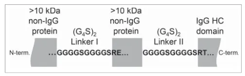 在使用HEK细胞表达一个Fc融合蛋白的时候,Roche的研究人员发现了G4S linker中的磷酸化修饰。下面是他们蛋白分子的示意图。