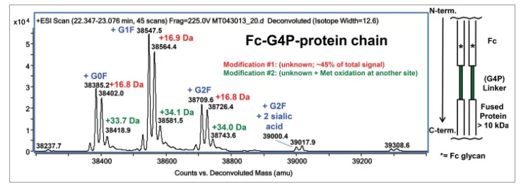 这两篇文章中的分子应该是一样的,除了linker由G4S改为了G4P:在Fc的C端通过G4P linker连接了生长因子蛋白。在还原分析的时候,发现主峰后面有一个约+17Da的峰,且比例高达45%。