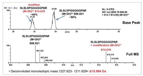 通过肽图分析,发现含有G4P linker的肽段含有较高比例的加16Da的峰(~40%)。