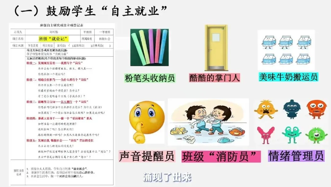 岗位创设:引导学生自主设计班级岗位,如粉笔头收纳员、声音提醒员、情绪管理员、班级 “消防员” 等,打破传统班委的固定模式,实现 “人人有岗、人人有责”。