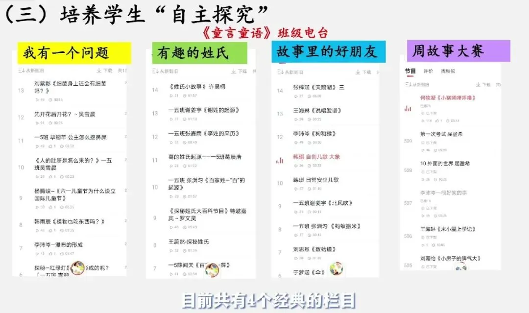 搭建展示平台:打造《童言童语》班级电台,设置 “我有一个问题”“有趣的姓氏”“故事里的好朋友”“周故事大赛” 等栏目。