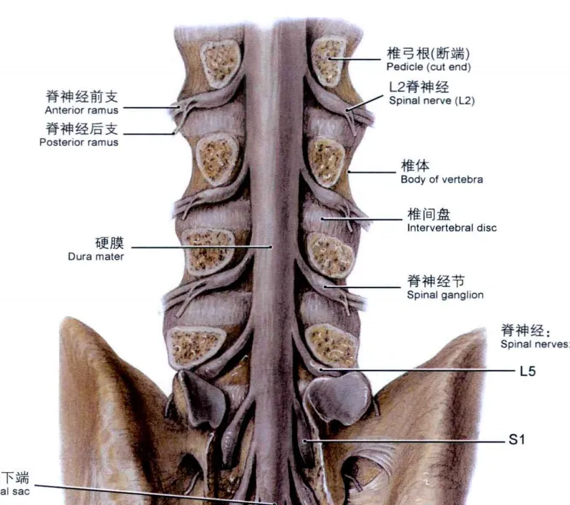 腰椎、骶椎的神经根从硬膜囊发出,与硬膜囊侧前方向远端走行,经由同节段椎弓根内侧后出椎间孔。L1至L4的神经根的发出位置往往较低,常位于相同节段椎体的中上1/3处发出。由于在椎管内走行距离较短,而且不经过椎间盘水平,因此椎间盘突出往往不会对上述神经根产生压迫。但当椎间盘脱出或合并中央管和(或)神经根管狭窄时,可压迫神经根。如果椎间盘突出为中央型巨大突出时,可压迫硬膜囊内的神经,从而在临床上出现相应的神经根损害表现。