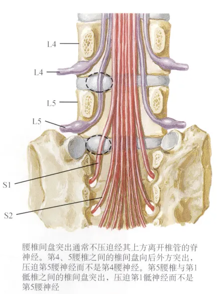 L5和S1神经根发出位置较高,常于上位椎体的中下1/3处发出,而且经过椎间盘水平后向远端走行,因此易受到突出的椎间盘的压迫。如L5神经根于L4椎体后方从硬膜囊内发出,向远端经L4/5椎间盘水平后向外经L5椎弓根内下方入椎间孔。因此,L4/5椎间盘突出时L5神经根常受累。
