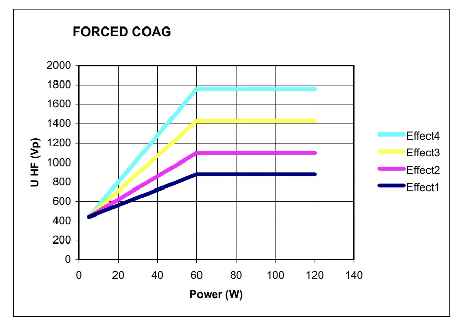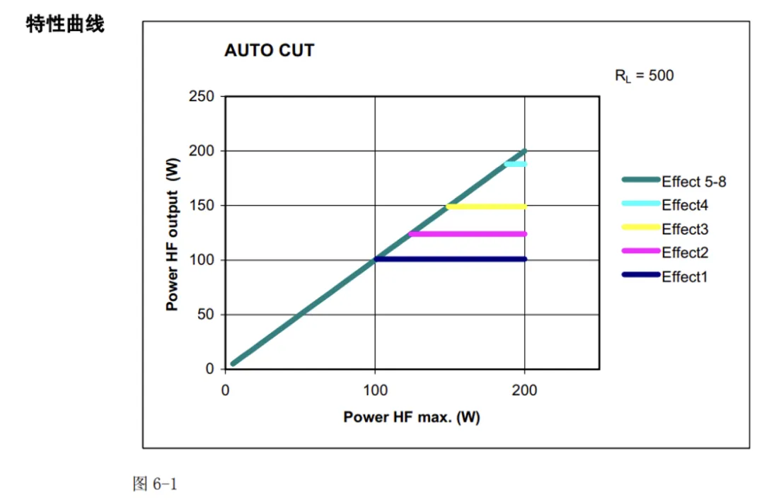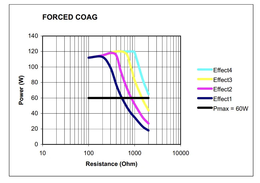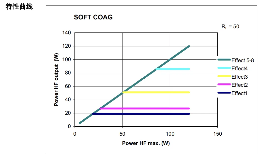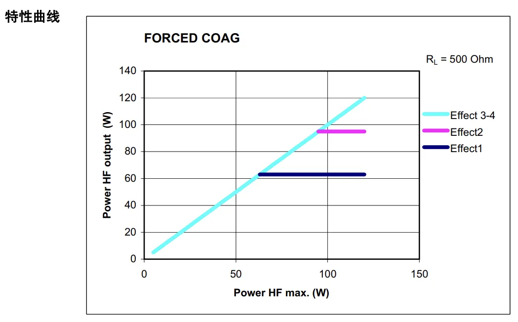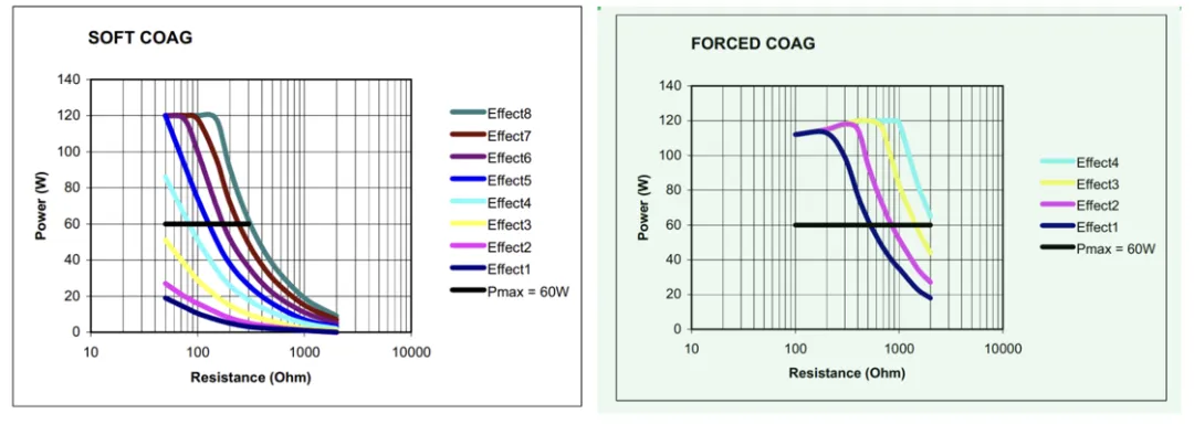 4.Forced coag:电凝止血最常用的模式,通过高压产生电弧,瞬时释放大量能量,组织快速升温,导致蛋白变性 + 表层炭化,到达快速止血的效果。 在标准负载 RL=50Ω 下,设定功率与实际输出功率之间的关系 实际输出功率与阻抗的关系,同样包括2部分:1)设置最大功率为