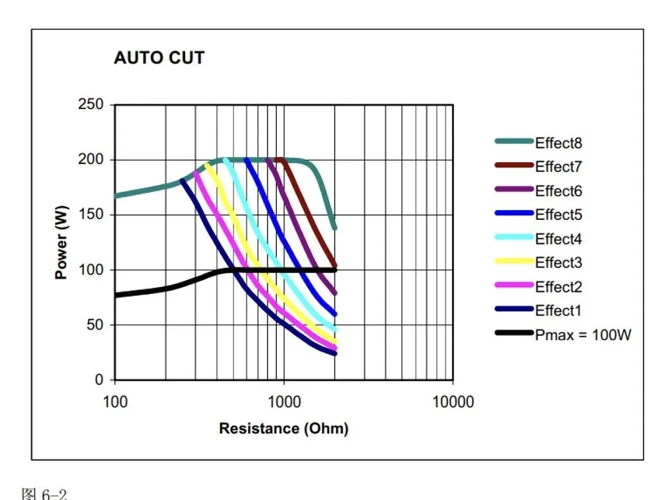 a、 所以即使最大输出功率设置为120W时,但Effect 1-4的输出功率是无法 达到120W的,effect 5虽能达到最大输出功率,但随着阻抗升高(>50Ω)会迅速下降,effect 6-8在阻抗大于50Ω时能够输出120W的最大值,但随着阻抗的继续升高(大于100Ω),其输出功率急剧下降。