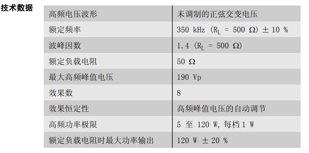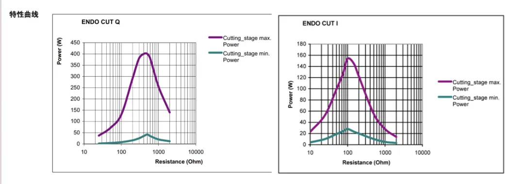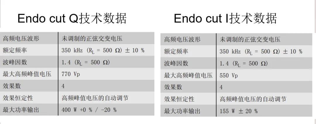 | 最大高频峰值电压 | | 770Vp | Q模式峰值电压及最大输出功率更高,意味着更强的组织击穿能力和产生电弧的潜力及强大的能量储备,在遇到高阻抗组织(如黏膜下层纤维或小血管)时,仍能保证有效的切割与凝固,确保剥离过程不因能量不足而停滞 I模式类似“精准的刀”:中低电压、中低功率,侧重在低功率下实现稳定、可控的切割,避免对管道周围组织(如胰腺、肠壁)的过度热损伤。 |