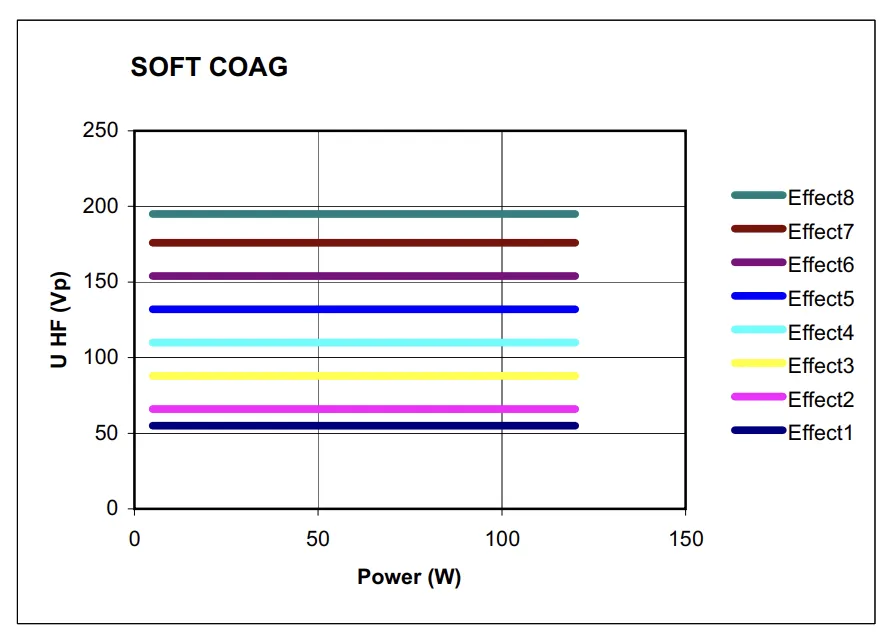 柔和电凝是一种比较常用的电凝止血方式,特点是:它采用连续、未经调制的低电压正弦波输出(高占空比)。其峰值电压极低(通常<200V),组织升温缓慢,没有切割效应。一个有意思的现象是:除了峰值电压和输出功率的数值较小外,SOFT COAG 与 AUTO CUT 在技术数据与特征曲线上都非常相似,这与它们共同使用的“连续正弦波 + 阻抗反馈控制逻辑”相关;但实质上它们的能量密度、电压水平与组织效应完全不同: 在标准负载 RL=50Ω 下,设定功率与实际输出功率之间的关系实际输出功率与阻抗的关系,同样包括2部分:1)设置最大功率为