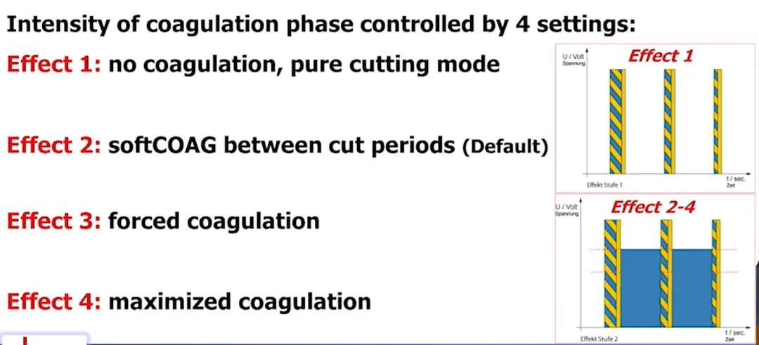| 柔和电凝 (Soft Coag) | 强力电凝 (Forced Coag) | 喷射电凝 (Spray Coag) |