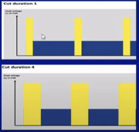 这个图标就比较简单了,就是描述的不同Effect允许输出的最大电压,从300-740V逐次升高。这里需要理解的一点是:设置的最大输出功率和Effect允许的输出电压,与实际的输出可能都是不一样,实际的输出是一个动态调节的过程,最大只是一个安全的上限,超过这个上限系统就会暂停。临床中应用最多的模式,EMR;ESD;EST等;其有2个子模式,Q与I。是一种能够自动交替切割与凝固的复合波形控制系统(示意图如下,其输出的切割部分是未经调制的正弦交变电压,在 时间层面 上通过周期性开断控制形成“切割–凝固”的复合输出)。预凝切开是切开之初结合预先电凝进行的切开。在切开的起始部分加入这种混合切开成分是爱尔博的专利设计,其主要就是能够让第一刀下去既能切开又能适当预防出血。这两张图描述了Endo cut模式(无论Q还是I模式)在切开相其输出的功率都是根据阻抗实时自动调整的。所以切开相的功率是不需要设置的。而其 模式中的 Effect 参数,主要影响切割脉冲之间凝固阶段的高频电压幅度。 | Endocut I 模式 | Endocut Q 模式 | |