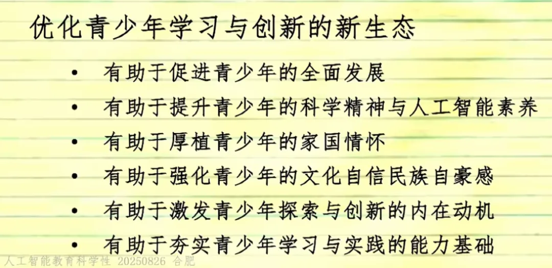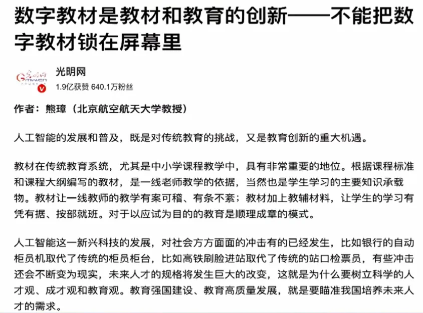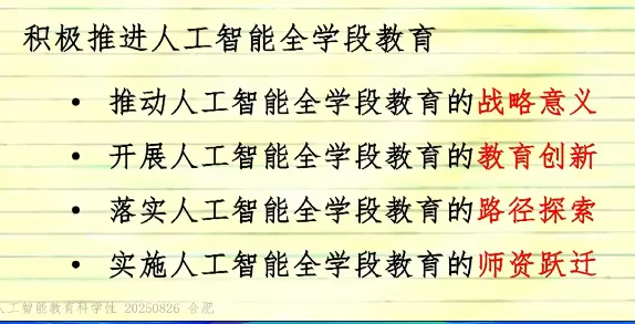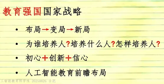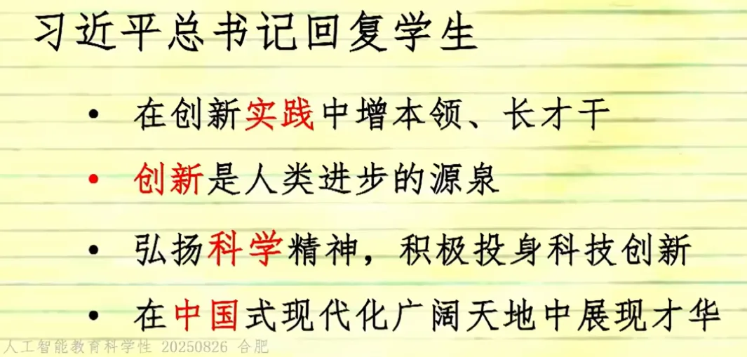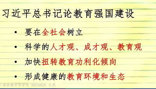 随着AI的进步,已经受到AI影响的,首当其冲的是那些在高技能岗位上的人(比如高级白领)。令人唏嘘的是,人力价值跌破零点并不是从最底层开始的,而是从“顶部中的底层”开始的。我们不需要让孩子在封闭的环境中反反复复地做模拟题,而是要让他们在开放的环境中解决真实的难题。既然学习的最终目的是解决问题,那一定是直接在解决问题中学习的孩子更厉害。但是目前身边的教学环境看到的是老师基本是在围绕AI能承担的基础教学任务:讲解概念、批改练习、答疑解惑,为自己每年的“被动KPI”所努力,而忽略了真正要专注的核心任务——引导讨论、培养批判性思维、激发创造力。我们应该如何去培养孩子最重要的能力“学习如何学习”,接受自己的知识随时可能过时,并能以极快的速度、极大的谦逊重新开始的能力。不管在写方案、纲要、指南等,一定要志于道,据于德,依于仁,游于艺坚持自立自强,突出应用导向,推动人工智能健康有序发展去探索,去实践,现在没有那条路最好,只要适合本地学情的就是最好教学工作中是在培养学生的科学素质、科学潜力,还是在培养考试能力和做题能力,灌输知识。必须瞄准 “培养有理想、有道德、有文化、有纪律的社会主义公民” 这一目标,而 “分数” 和 “应试” 不是教育目标。立德树人的初心,要求教育工作者加快扭转教育功利化倾向。启发我在教学工作中围绕这四个词展开:实践、创新、科学、中国 跟分数没有关系,能在真实情境中解决问题才是关键。以前是学好了再用,现在科技的进步我们是在应用中去学习。这边我能做的是去开发符合本地学情的校本课程,构建数字化教材,尝试教学全流程“上线”,实现数字化变革,让数据可以看得见,可以分析,可以决策。- 教学方法要从满堂灌转变为自主式、项目式、探究式、合作式