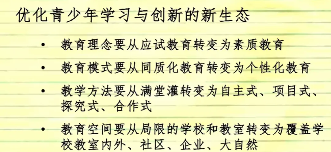 - 教育空间要从局限的学校和教室转变为覆盖学校教室内外、社区、企业、大自然