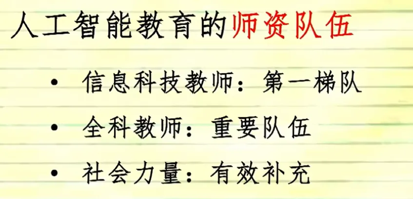师资队伍建设:信息科技教师是第一梯队,全科教师是重要队伍,社会力量作为有效补充。http://www.moe.gov.cn/jyb_xwfb/moe_2082/2024/2024_zl04/202403/t20240314_1120287.html