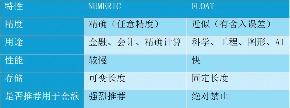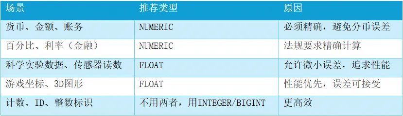 口诀:“钱用NUMERIC,数用FLOAT”——涉及金钱必选精确类型!