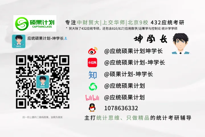 很多同学进来自然是为了进群的,不需要我们解释,所以我们也直奔主题,只要你是27考研,且目标院校大概率是985/211中选一个,欢迎加入我们的QQ/微信群~QQ群进群方式:扫描下方二维码即可(群内有最新院校信息,免费真题,还有更多惊喜等你来~)微信群进群方式:各位同学可以加硕果计划-坤学长微信:1078636332,备注:27考研进群,通过后学长会拉大家进群哈~有任何统计考研相关的问题也都可以直接咨询坤学长~能收获的可太多啦!从免费教材,到上岸经验贴。从院校解析到择校指导,再到知识点解析。一言概之,你在考研中碰到的问题,都可以在这里找到答案!并且你还会收获热情的学长学姐,还有在这一年里并肩前行的战友~在这个群里,你一定能够度过充实的一年~感谢能看到这里的小伙伴~下面,我们就正式介绍一下自己!我们是硕果计划学长学姐团队,该团队是由统计学科排名第一的人大统计硕博小伙伴组建,丰富统计考研辅导经验,累计帮助上千人上岸!用心打磨,只做精品!硕果计划以培养与本科通识教育不同的升维思考和降维执行能力,让你的统计思维全面提升,进而考取高分!我们在公众号/B站/知乎都有组织~直接搜索【应统硕果计划】即可!至于我们的可信度,详情可以戳下方推文查看(点击蓝色文字即可跳转),简单来说是人大、中财和贸大的统计考研辅导都做到了市面上的No.1!其余高校也都有不错的成绩!所以说,考985/211高校的统计,认准硕果计划准没错!总之,现在考研竞争还是蛮激烈的,尤其是近几年随着大数据/人工智能的火爆,统计专业毫无疑问属于风口上的行业,硕士毕业后年薪30w,40w的大有人在,因此也吸引了hin多的小伙伴来报考,27考研也就是今年2026年底考,除去中间各种节假日等等,其实时间真的不多!所以现阶段开始准备也还是很有必要的~一起进群加油吧!!!