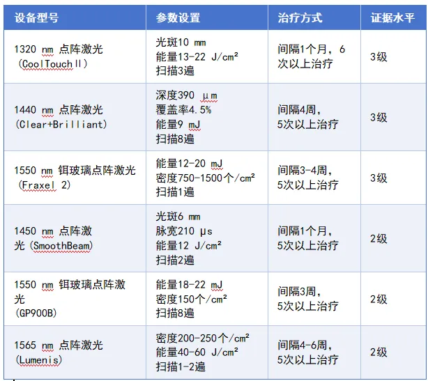 3.4.6具体参数(依据激光美容相关常见疾病诊疗指南(2024版)痤疮瘢痕总结- 萎缩性痤疮瘢痕:对厢车状、滚动状瘢痕有轻至中度的改善。(因为厢车状、滚动状瘢痕是可膨胀的。大多数基底部较深的冰锥状瘢痕对切除的反应比点阵激光好,而滚动状瘢痕可能要求细分后再行点阵激光治疗。)