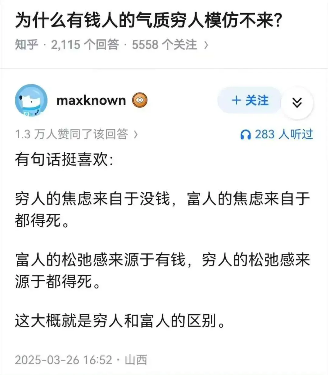 一个人物质匮乏,他在这个世界上就会如同在地狱一样,一个人物质充沛,他则会感受到这个世界的种种善意,穷是一切的痛苦的根源,穷就是一种原罪。