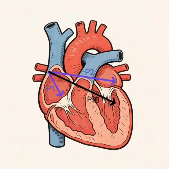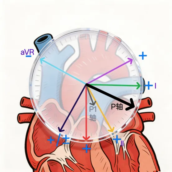 Ⅲ导联与P轴夹角>90°,应为倒置,但P轴的前1/3时间为P1轴,P1轴与Ⅲ导联夹角为锐角,所以Ⅲ导联的P波可为正负双向,如下图所示。