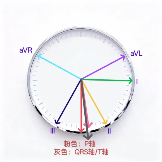 在钟表盘上把电轴和肢体导联标出来。从下图的P轴与导联的关系分析:P轴与Ⅰ导联的夹角为接近90°的锐角,则Ⅰ导联P波低平;P轴与aVL导联形成的夹角>90°,则aVL导联P波为负向,P轴与aVR夹角为最大,则aVR导联上的P波负向程度为最深。
