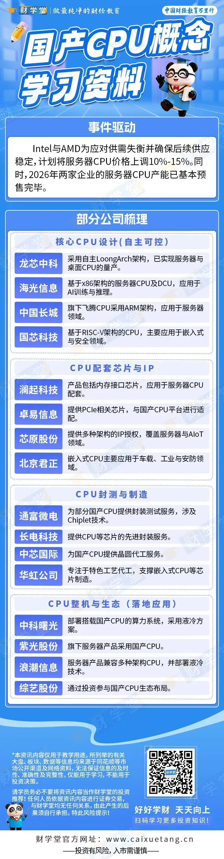 近期AMD与Intel计划上调服务器CPU价格,幅度为10-15%。同时,两家企业2026年的产能已基本预订一空,国产CPU 替代需求持续升温。