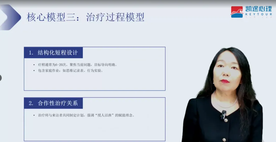 同时,赵老师还在这一节拆解了CBT的技术干预模型——认知重构帮我们替换不合理信念,行为激活帮抑郁的人慢慢恢复活力,暴露疗法帮焦虑的人逐步面对恐惧;而治疗过程模型则强调“短程结构化”,通常6-20次咨询就能聚焦问题、明确目标,还会搭配家庭作业巩固效果,让改变不只发生在咨询室里。