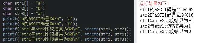 - strcmp()在比较的时候会把字符串先转换成ASCII码再进行比较,返回的结果为0表示s1和s2的ASCII码相等,返回结果为1表示s1比s2的ASCII码大,返回结果为-1表示s1比s2的ASCII码小,例如: