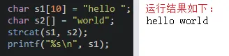 - strcat在使用时s1与s2指的内存空间不能重叠,且s1要有足够的空间来容纳要复制的字符串,如: