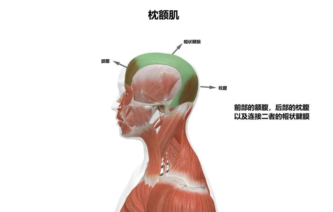 枕额肌是头部一块非常特殊且重要的肌肉,它并非一块单一的肌肉,而是由前部的额腹、后部的枕腹以及连接二者的帽状腱膜共同构成。