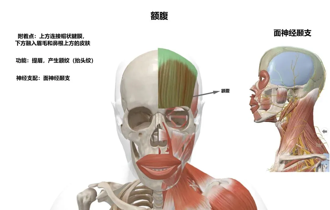· 功能:提眉,产生额纹(抬头纹),表达惊讶、恐惧等表情。