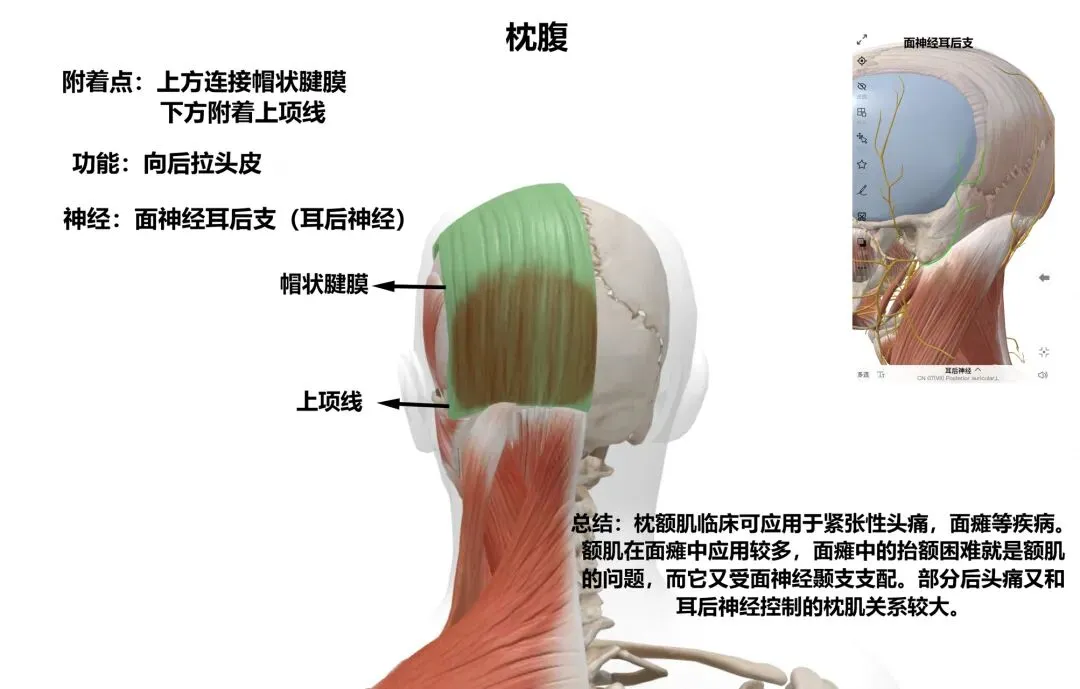 · 附着点:上方连接帽状腱膜,下方附着于上项线(枕骨后方的骨性隆起)。