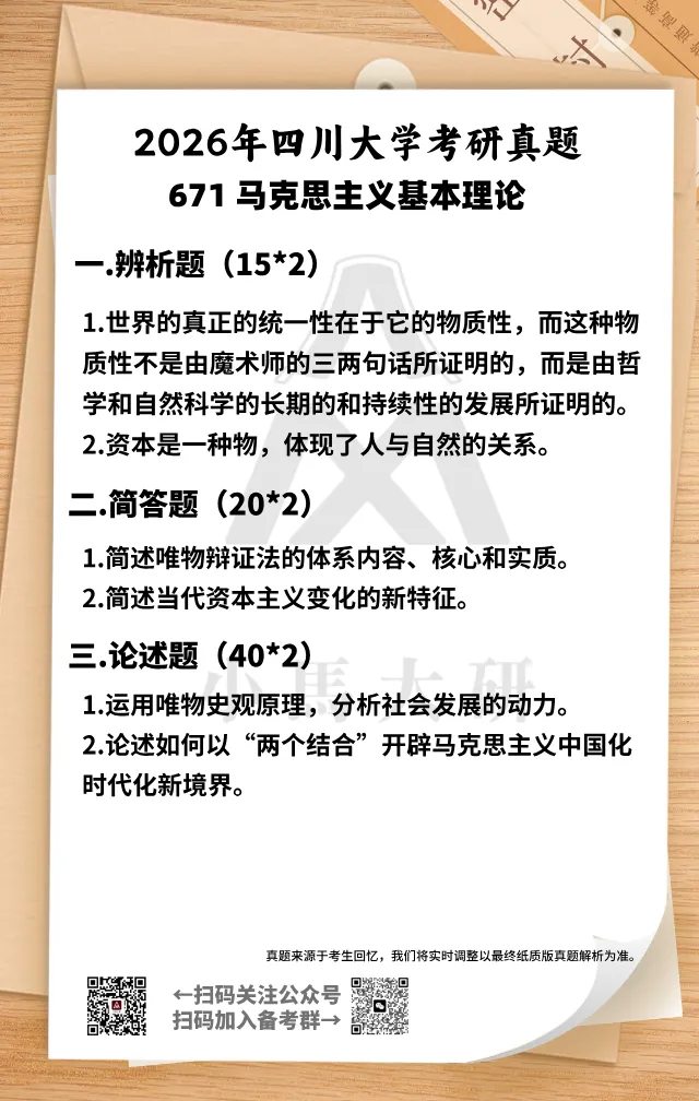 同时,值得注意的是川大真题依旧出现冷饭热炒的情况,例如2023年曾出现过的辨析题“资本不是物”,以及再次对于两个结合的考察。