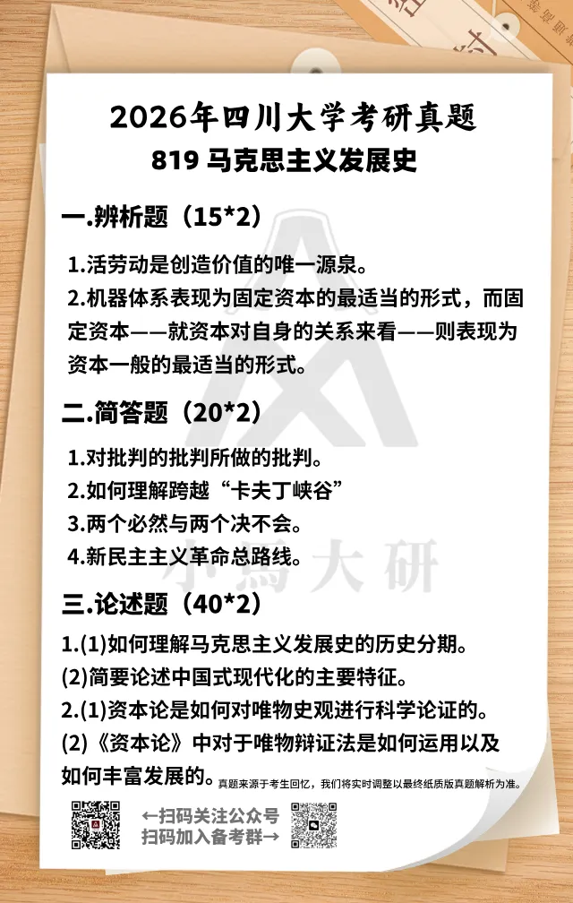 综合来看,川大真题依旧以教材为主要命题依据,绝大多数考点均可在课本中找到明确来源,这也决定了复习中“吃透教材”依然是最具性价比的选择。但与单纯记忆式考查不同,川大更强调在教材基础上的灵活调用,同样的知识点,是否能够结合原著、运用方法论展开论述,直接影响得分层次。