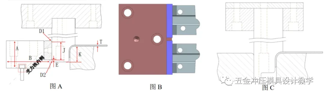 6:如下图 C 成型面较小,空间不够做不下靠块时可以考虑将成型凹模和靠块做一起,冲头靠块面做油槽;