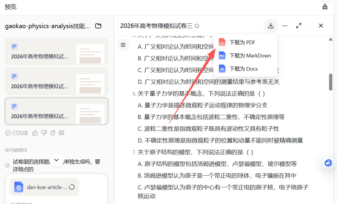 7.经过多轮的调试优化最终生成完整的高考试题(如下)