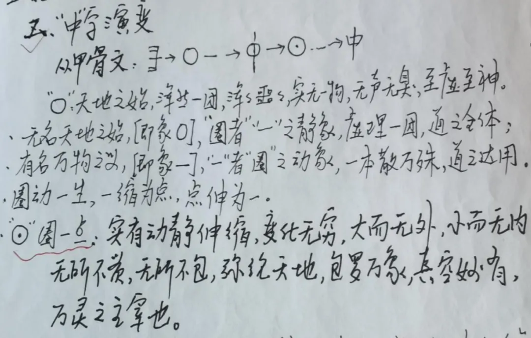 1、“中”字演变 (俯视图)。“O”,天地之始,浑然一团,浑浑噩噩,实无一物,无声无臭,至虚至神。无名天地之始,象"O"。“O”者“一”之静象,虚理一团,道之全体;有名万物之义,即象“一”,“一”者“O”之动象,一本散万殊,道之达用。"O"动"一"生,"一"缩为点,点伸为"一"。