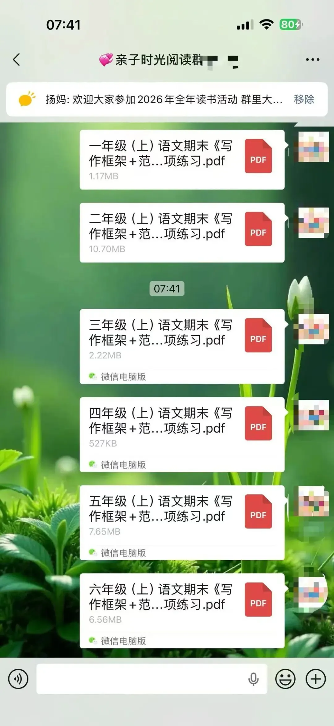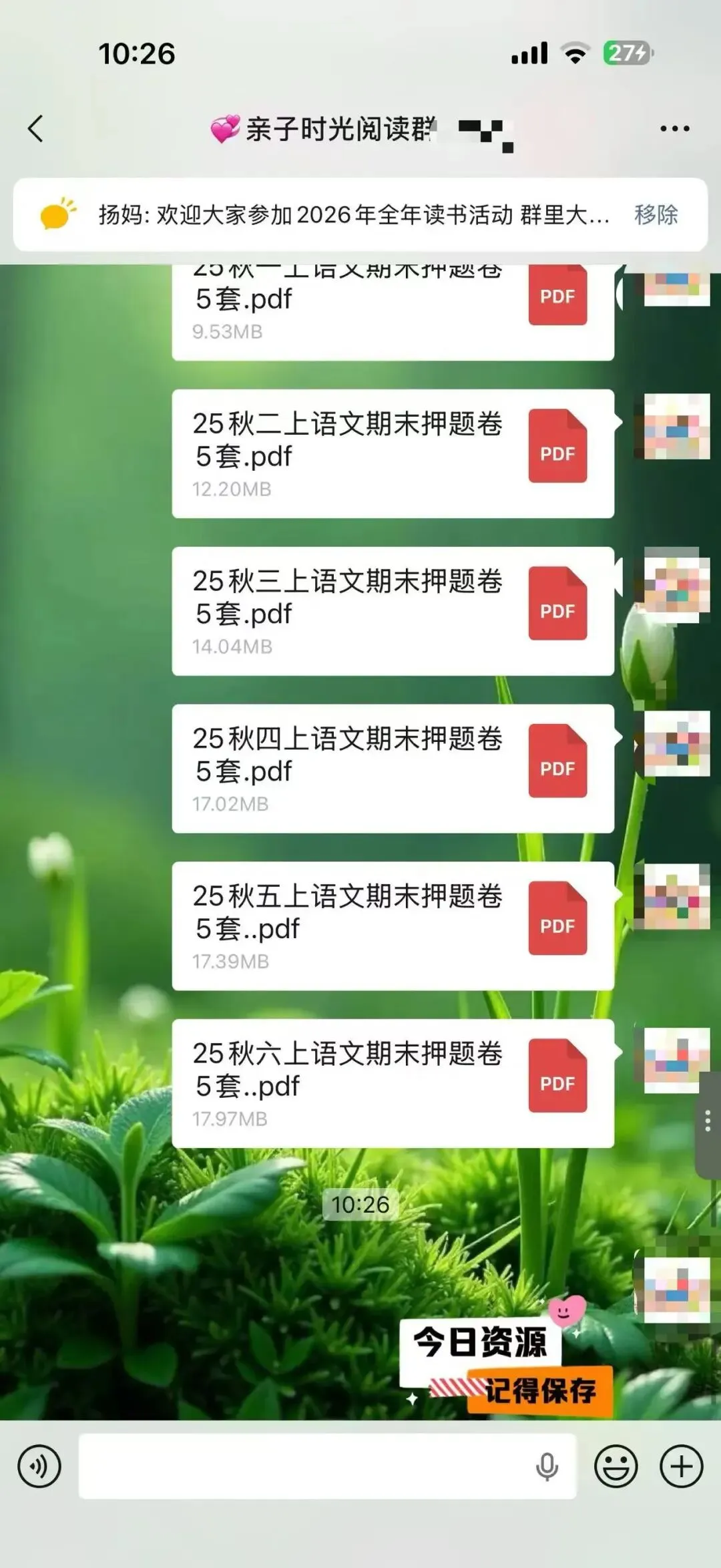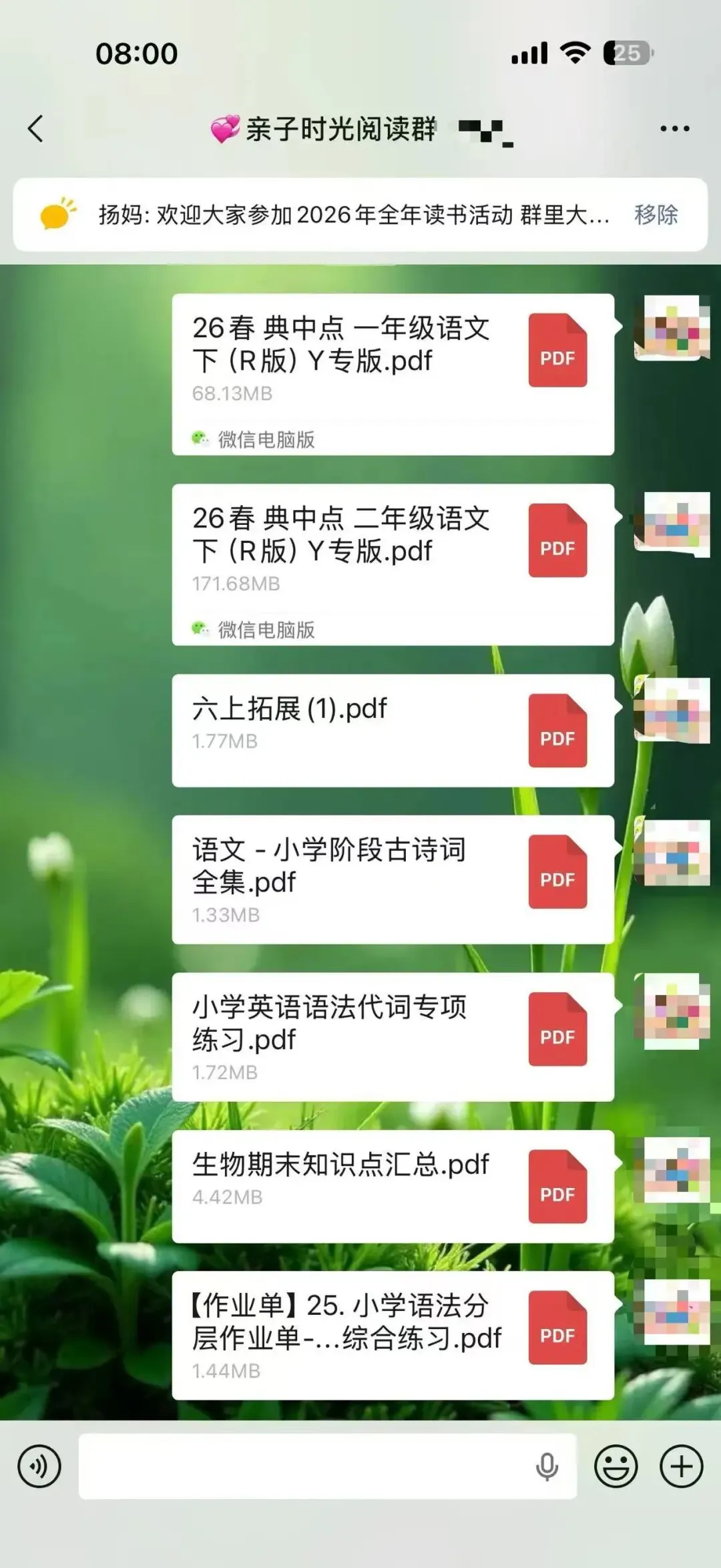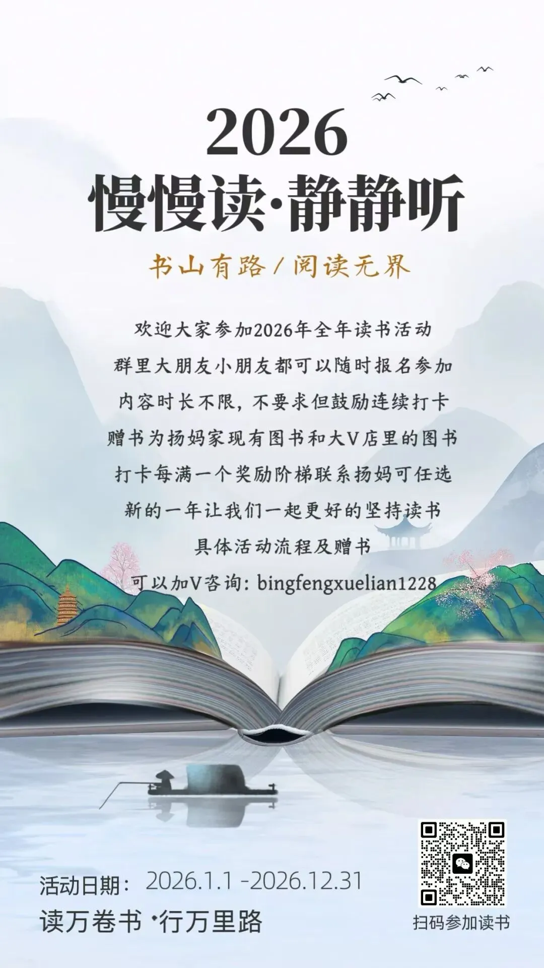 从2025年3月开始,我在自己的小群里每天分享适合幼儿园到高中的学习资料,以适合小学生和初中生的资料居多。有音频,有视频,有图文,有文档,形式不一,只有我获得了新的资源都会第一时间毫无保留的分享到我的群里。我的群里基本都是宝妈,基本上也都是家长,我知道这些资料对于她们来说,肯定是需要的,不一定都需要,但只要有哪怕一个需要,我都觉得值了,做这件事就是有意义的。也经常会收到群里朋友的反馈,有的表示给娃打印出来用上了,有的说复习的时候用上了,为学校的测试做了铺垫。有时候会有群友在群里@我问有没有某某资料?或者有没有哪个年级的试卷,我都会及时回复,并帮其查找。大部分是可以找来发给对方,也有个别时候一时没有找到合适的,则会记录下来,等有了再分享到群里给她。不知不觉2025年坚持到了最后一天,迎来了全新的2026年,很快也15天过去了。这件事因为喜欢,也就有动力,每天分享起来也不觉得辛苦,反而是乐在其中。这可能就是助人为乐的感觉吧。虽然大家绝大多数都素未谋面,但彼此感觉很亲切,有的朋友在我的群里已经好几年了。以前是经常分享关于阅读的,学习的,练字的,育儿日常的,晒娃晒购物,给孩子买了什么都想在群里分享出来,一个喜欢分享的宝妈吸引来更多喜欢分享的宝妈,大家都像云姐妹一样,把群当成自己的家,无拘无束。后来,随着孩子慢慢长大了,不再喜欢让拍照和记录成长了,也有了自己的隐私意识,不太愿意让过多分享他们的学习情况尤其是考试情况等。我们也都尊重孩子,把重心放在默默陪伴和自然而然的提供资源,以及自我成长,给娃做榜样方面。我也默默的为大家做些事,每天默默的分享我觉得对大家有帮助的资料和资源。日子过得很快,一转眼300多天过去了,那么,我会继续坚持下去吗?这个群也会一直保留,群里总会不断的有需要成长的娃和宝妈,将来,N多年后可能还会有群三代,那个时候,我也就荣升宝奶奶或宝姥姥啦!只要还健康,只要还能自动行动,我还会一直分享下去。分享的内容可能会有改变,但一定是我觉得对大家有益的事物,或许是学习资料,也或许换其他的内容和形式。添加微信:bingfengxuelian1228 备注几年级,给你发资料,不要钱,多个朋友多份温暖~另外,想参加读书打卡阅读赠书活动的朋友,可以看一下这张海报。