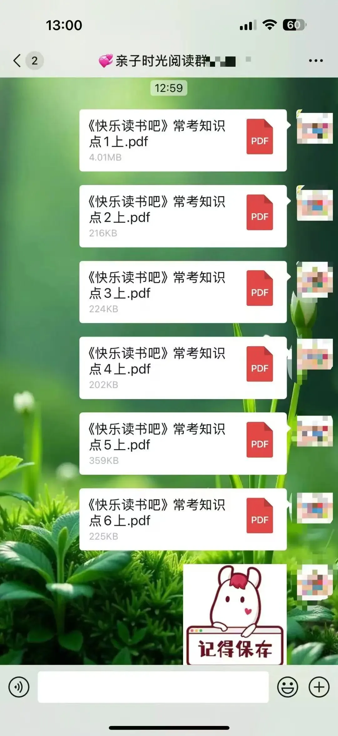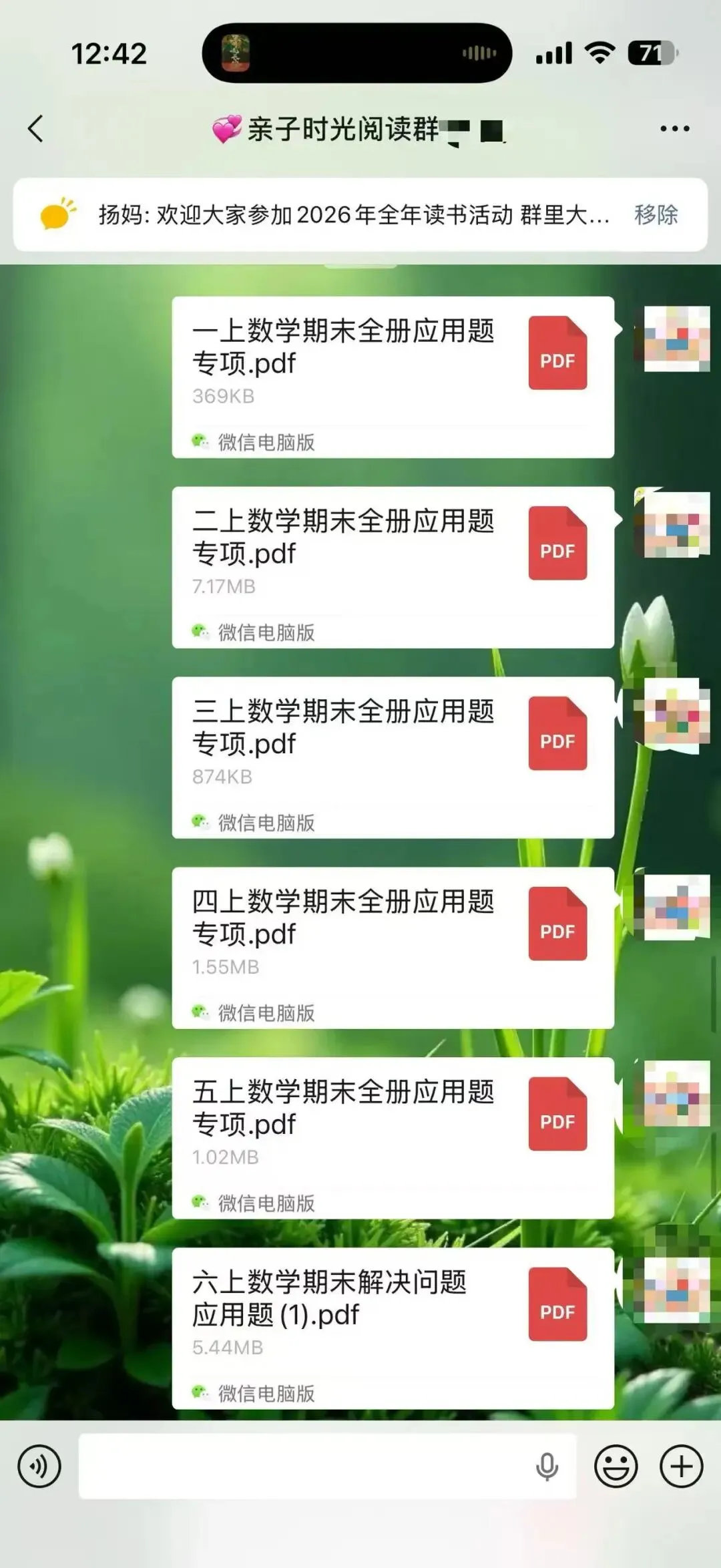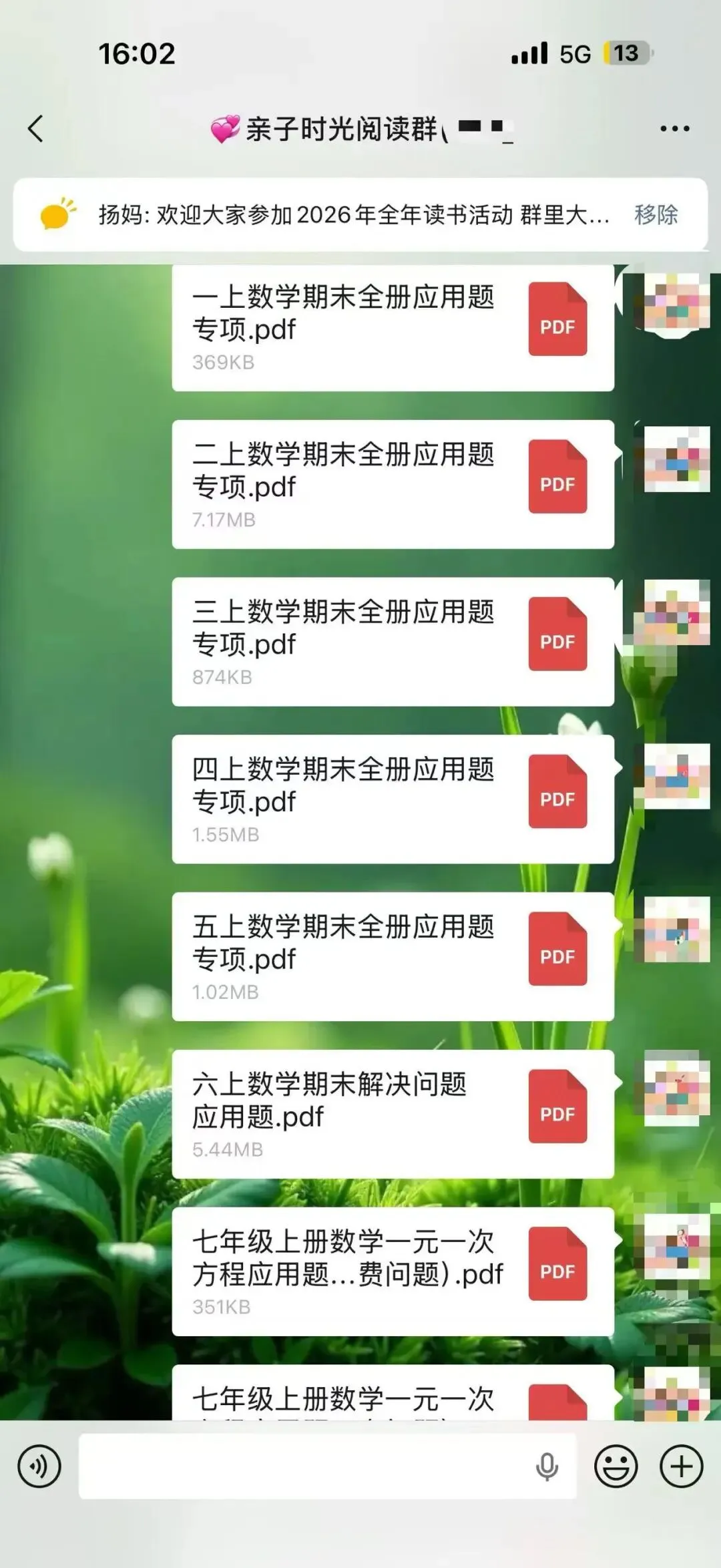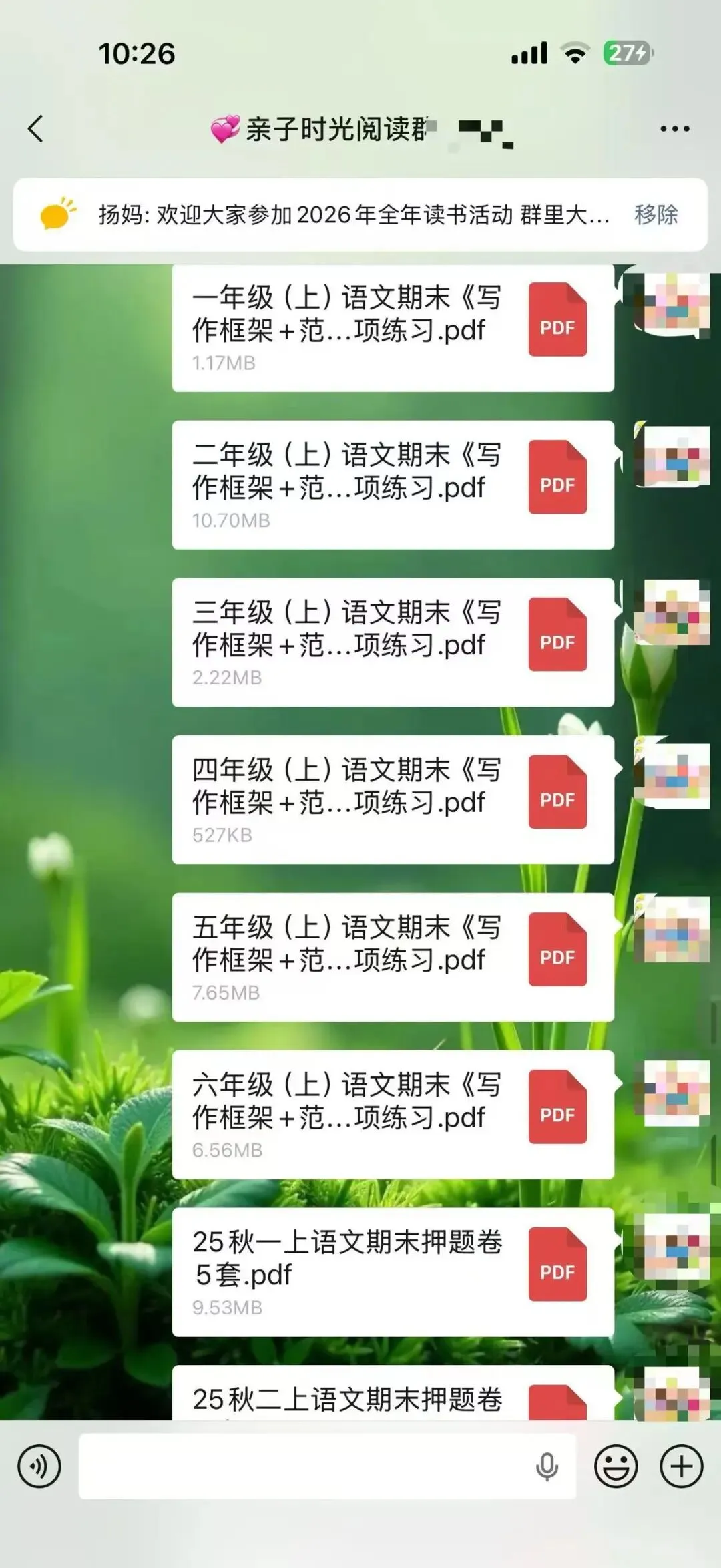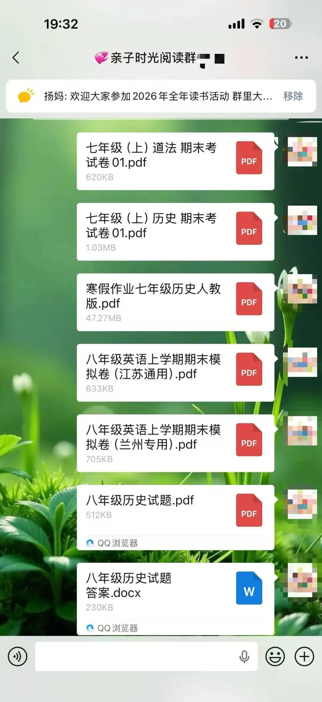 从2025年3月开始,我在自己的小群里每天分享适合幼儿园到高中的学习资料,以适合小学生和初中生的资料居多。有音频,有视频,有图文,有文档,形式不一,只有我获得了新的资源都会第一时间毫无保留的分享到我的群里。我的群里基本都是宝妈,基本上也都是家长,我知道这些资料对于她们来说,肯定是需要的,不一定都需要,但只要有哪怕一个需要,我都觉得值了,做这件事就是有意义的。也经常会收到群里朋友的反馈,有的表示给娃打印出来用上了,有的说复习的时候用上了,为学校的测试做了铺垫。有时候会有群友在群里@我问有没有某某资料?或者有没有哪个年级的试卷,我都会及时回复,并帮其查找。大部分是可以找来发给对方,也有个别时候一时没有找到合适的,则会记录下来,等有了再分享到群里给她。不知不觉2025年坚持到了最后一天,迎来了全新的2026年,很快也15天过去了。这件事因为喜欢,也就有动力,每天分享起来也不觉得辛苦,反而是乐在其中。这可能就是助人为乐的感觉吧。虽然大家绝大多数都素未谋面,但彼此感觉很亲切,有的朋友在我的群里已经好几年了。以前是经常分享关于阅读的,学习的,练字的,育儿日常的,晒娃晒购物,给孩子买了什么都想在群里分享出来,一个喜欢分享的宝妈吸引来更多喜欢分享的宝妈,大家都像云姐妹一样,把群当成自己的家,无拘无束。后来,随着孩子慢慢长大了,不再喜欢让拍照和记录成长了,也有了自己的隐私意识,不太愿意让过多分享他们的学习情况尤其是考试情况等。我们也都尊重孩子,把重心放在默默陪伴和自然而然的提供资源,以及自我成长,给娃做榜样方面。我也默默的为大家做些事,每天默默的分享我觉得对大家有帮助的资料和资源。日子过得很快,一转眼300多天过去了,那么,我会继续坚持下去吗?这个群也会一直保留,群里总会不断的有需要成长的娃和宝妈,将来,N多年后可能还会有群三代,那个时候,我也就荣升宝奶奶或宝姥姥啦!只要还健康,只要还能自动行动,我还会一直分享下去。分享的内容可能会有改变,但一定是我觉得对大家有益的事物,或许是学习资料,也或许换其他的内容和形式。添加微信:bingfengxuelian1228 备注几年级,给你发资料,不要钱,多个朋友多份温暖~另外,想参加读书打卡阅读赠书活动的朋友,可以看一下这张海报。