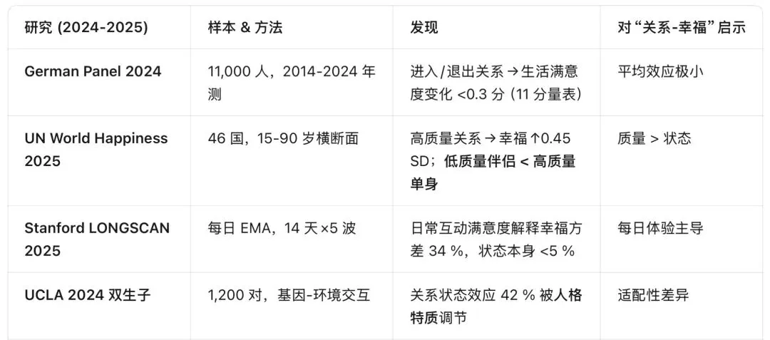 “关系 ≠ 幸福”:2024-2025 五项跨国纵向研究显示,关系状态对幸福感的平均影响很小(Cohen’s d ≈ 0.2),且高度取决于关系质量与个体适配;高质量单身优于低质量伴侣,而高质量伴侣优于高质量单身——“适配”比“状态”更重要。