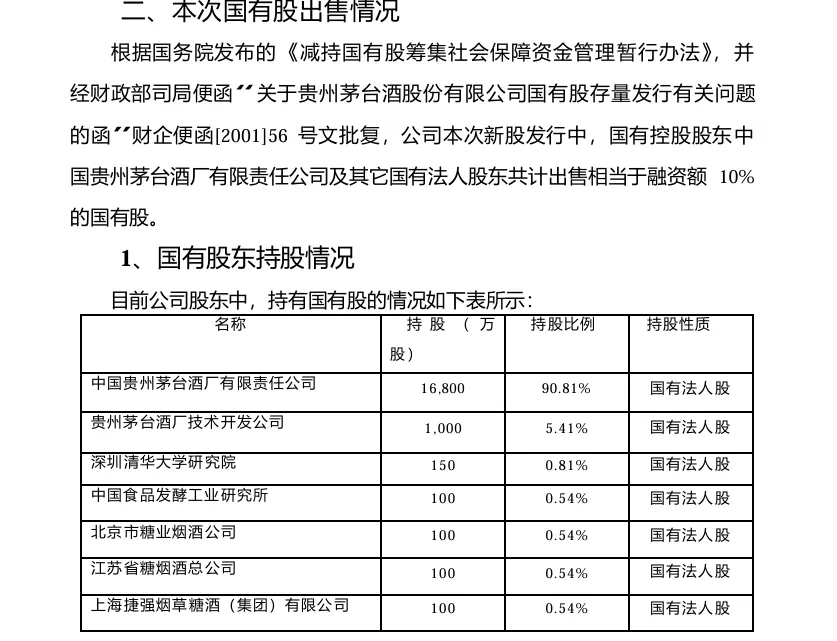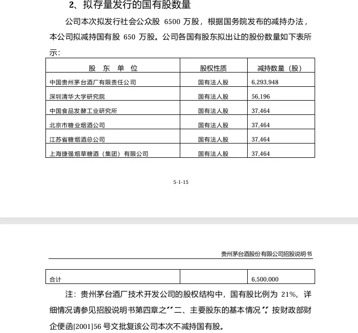 所以我们看到,贵州茅台的原始股东中除了技开公司因为国有股比例只有21%不需要减持以外(图2),其他6家股东均减持部分股份(按持股比例)凑够650万国有股进行减持。