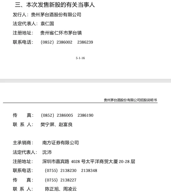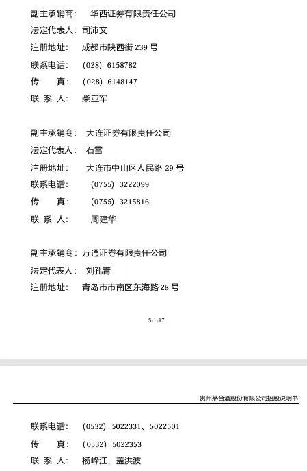 有关当事人(图3)包括上市公司(贵州茅台股份有限公司)、主承销商(南方证券有限公司),可以看到深圳在2001年已经资金比较充裕了;副主承销商(图4)有华西证券(成都)、大连证券(大连)、万通证券(青岛)3家,4家承销商基本覆盖中国的南、西、北、东四个方位,这是由于当时互联网还不够普及,承销明显呈现区域分布的特点。