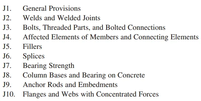 | J1:通用规定 J2:焊缝和焊缝接头 J3:螺栓、螺栓节点 J4:节点和受影响的构件 J5:填充物 J6:拼接 J7:承载能力 J8:柱脚和混凝土基础 J9:锚栓及预埋件 J10:承受集中力的腹板和翼缘 |