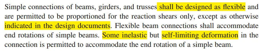 Simple connections (理想的铰接连接) | 1、shall be designed as flexible connections(reactions shear only) 2、Flexible beam connection is permitted to have end rotation →允许出现非弹性和自我限制的变形即会出现被允许转动