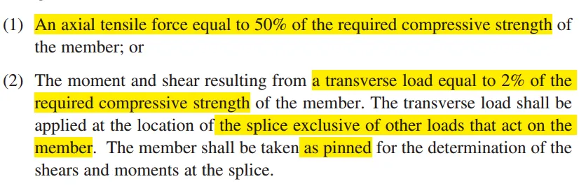 Compression members with bearing joints (压杆的连接节点) | 1、承压的压杆的splice足够大(端铣平)足以直接抗压 2、非承压的压杆的splice截面要保证对中(in line),强度要求不小于下面两条要求: