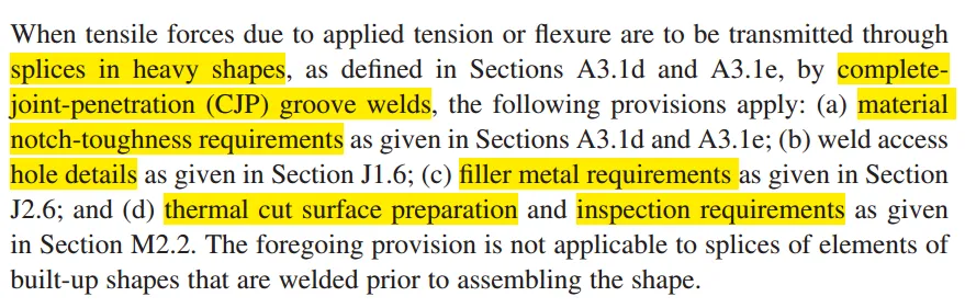 Splices in heavy sections (厚板) | 如果全熔焊坡口焊连接节点处要传递拉力,则要在焊材的韧性、坡口尺寸、焊材金属、焊接表面的处理即检验要求等有详细的要求(工厂焊的不需要满足):