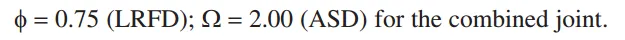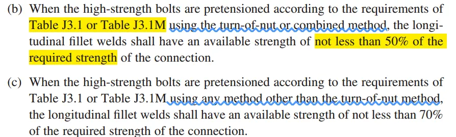 3、高强螺栓具体要求详见J3.1,且能提供的强度值不得小于所需强度的33%;当考虑共同作用的时候,角焊缝提供的强度不能小于所需总强度的50%或70%(区别在于螺栓的连接工艺不同);