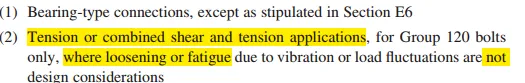 Snug-Tight Condition ( snug-tight )承压型 对应国标的承压型 | 其实就是拧到钢板紧密贴紧,看不见肉眼缝隙(依靠螺栓本身的承压和抗剪能力) 1、常用于bearing-type connections,通过螺栓抗剪和连接板承压来传递荷载 2、Group120螺栓当受拉或拉剪,且用于不存在松动和疲劳的情况。