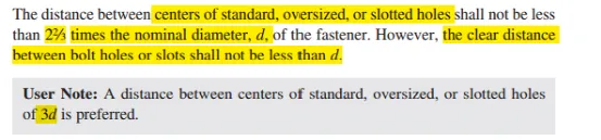 J3.5规定了螺栓最小边距的要求:标准孔型的最小边距要求详见TABLE J3.4/J3.4M;oversize hole和slotted hole的最小边距=标准孔的最小边距+额外增量C2,其实就是额外补偿了孔洞扩大后材料的削弱,C2表格详见TABLE J3.5/J3.5M。