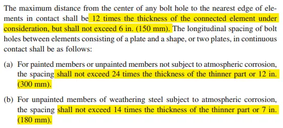 J3.6规定了螺栓之间和螺栓与构件的最大间/边距要求:
