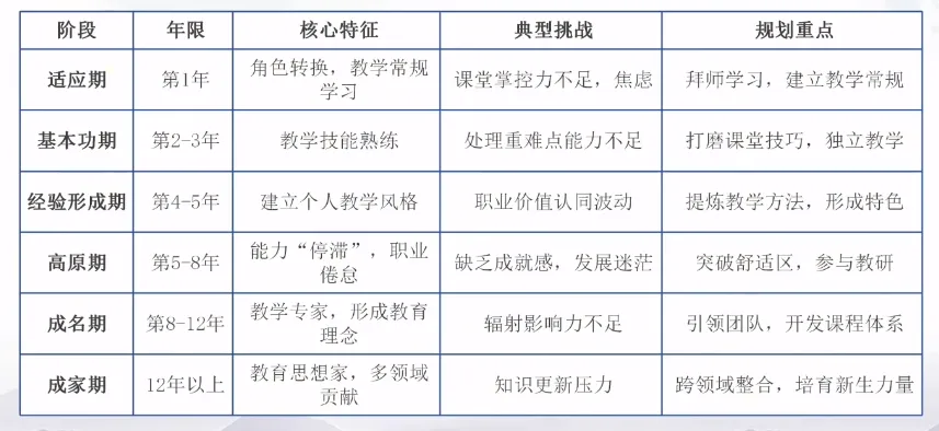 先了解自己处的发展阶段:教师职业生涯可分为六个典型阶段,每个阶段面临不同的挑战和发展重点。