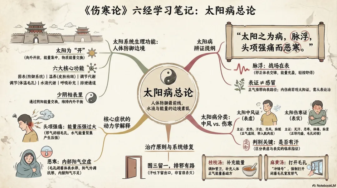 So What? 深度洞察: 为什么太阳病必见“恶寒”?这并非感染寒冷,而是 系统资源的重新分配 。为了在边界建立防线,阳气被强制调往表部,导致内里虚寒;同时,由于表层毛孔闭塞导致水液停滞(水是寒的),系统产生了寒冷的体感反馈。